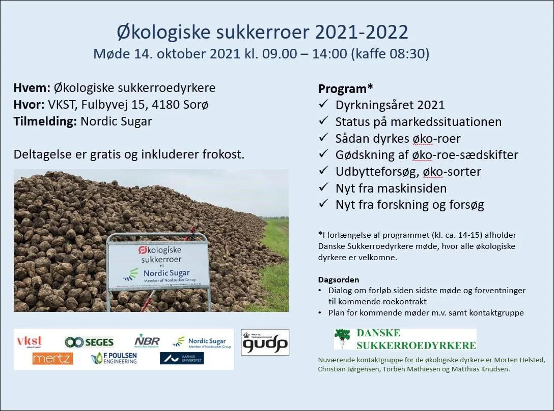 Den 14. oktober 2021, kl. 9.00 -14.00 afholdes der møde om økologiske sukkerroer i Sorø med emner indenfor dyrkning, markedssituationen, maskinsiden samt forskning og forsøg. Fra kl. 14.00 - 15.00 afholder Danske Sukkerroedyrkere et dyrkermøde for de økologiske dyrkere.